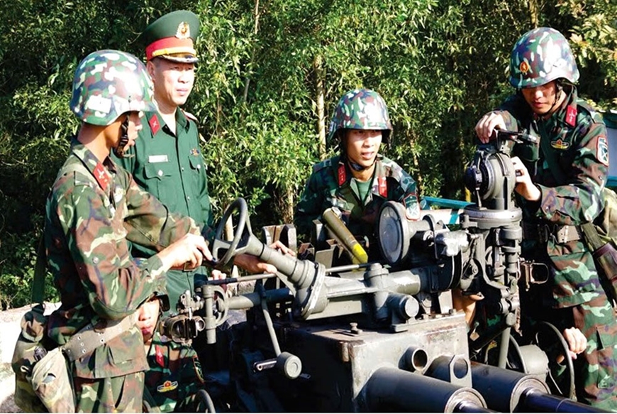 | Chỉ huy Lữ đoàn 573 kiểm tra công tác hiệp đồng của khẩu đội pháo phòng không 37mm. Ảnh: TRƯƠNG LINH |