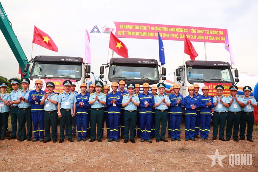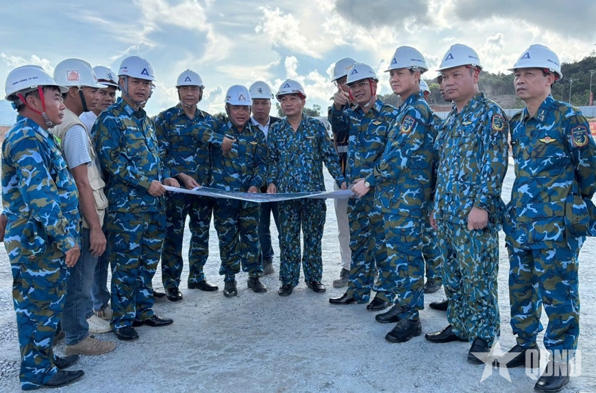 Đại tá Nguyễn Mai Đô, Chủ tịch Tổng công ty Xây dựng công trình hàng không ACC (thứ 5 từ phải qua) kiểm tra tiến độ thi công