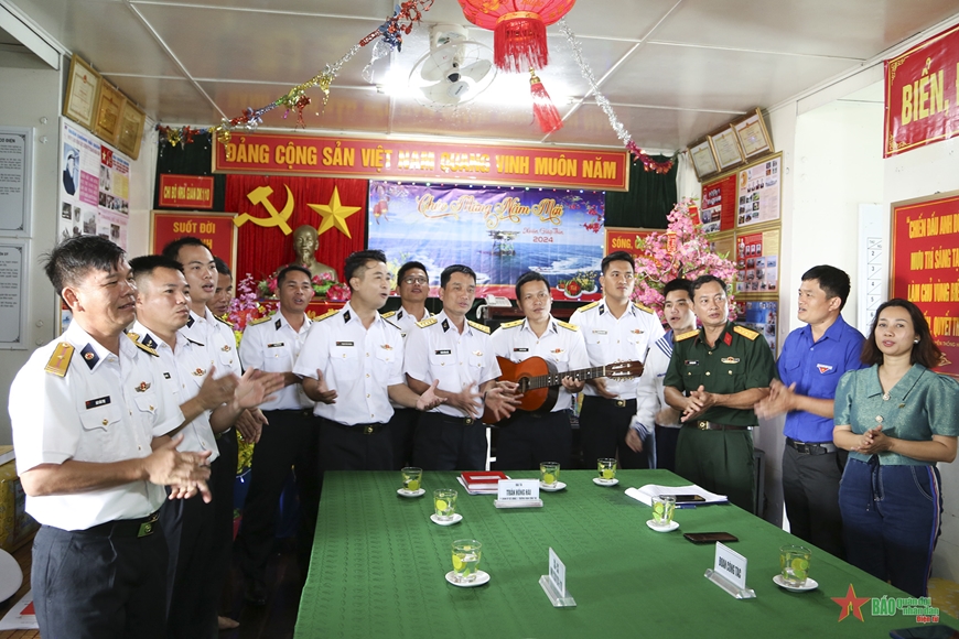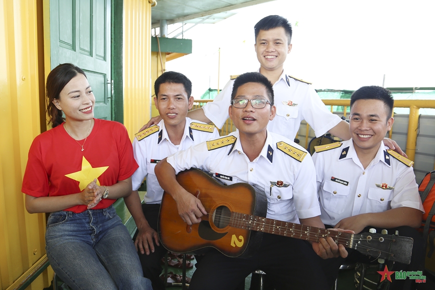 | Giao lưu văn nghệ giữa đoàn công tác và cán bộ, chiến sĩ Nhà giàn DK1/10. |