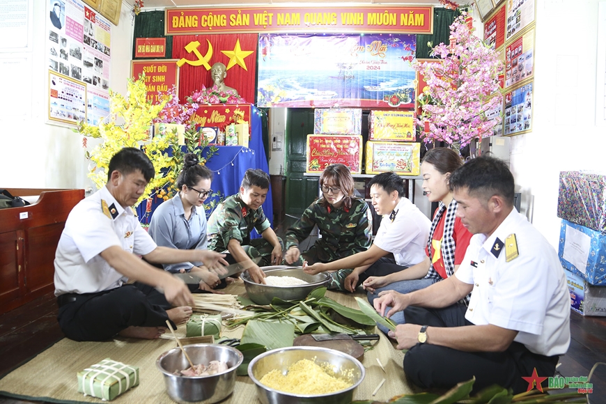 Không khí đón Tết sớm sôi nổi hơn khi các hoạt động gói bánh chưng, giao lưu văn nghệ được tổ chức giữa đoàn công tác và cán bộ, chiến sĩ trên các nhà giàn. Khi ấy các cán bộ, chiến sĩ được dịp để thể hiện tài năng “nội trợ”. Thiếu tá QNCN Bùi Văn Thọ, Nhân viên Quân y Nhà giàn DK1/10 vừa gói bánh chưng vừa chia sẻ: "Năm nào tôi cũng tham gia gói bánh chưng kể cả khi ở nhà lẫn khi ở đơn vị. Nhưng có lẽ gói bánh trên nhà giàn để lại cho tôi nhiều cảm xúc nhất. Trong sự thiếu thốn về vật chất là sự ấm áp và đầy đủ về tình đồng chí, đồng đội. Mỗi người một quê nhưng như một gia đình, cùng yêu thương, chia sẻ để đón Tết, vui Xuân trọn vẹn nhất. Như hôm nay, được nhận quà và đón Tết sớm với đoàn công tác mỗi chúng tôi tự thấy mình thật là vinh dự. Đây sẽ là động lực vô cùng lớn và là món quà ý nghĩa nhất dành cho chúng tôi vào dịp năm mới. Chúng tôi xin hứa sẽ vui Xuân an toàn, sẵn sàng chiến đấu cao để hoàn thành xuất sắc nhiệm vụ trực Tết nơi biển, đảo tiền tiêu".