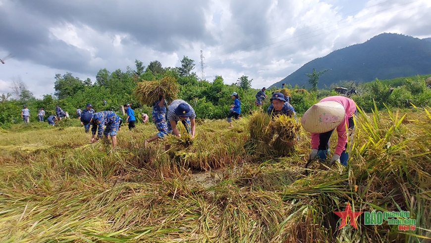 | Tuổi trẻ Học viện Hải quân giúp dân thu hoạch lúa. |