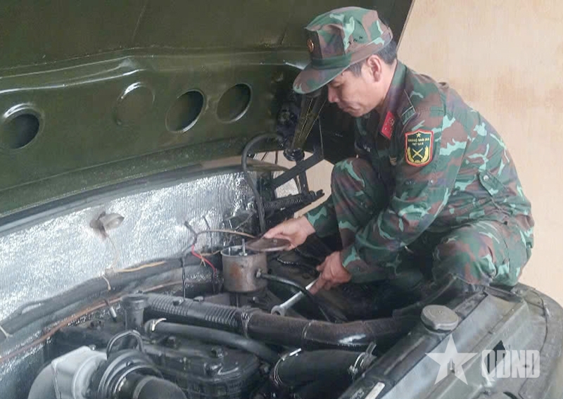 | Thượng úy QNCN Lê Xuân Lai bảo dưỡng, sửa chữa xe quân sự. |