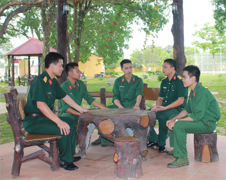 | Cán bộ Trung đoàn 102 trò chuyện, động viên chiến sĩ trong ngày nghỉ. |