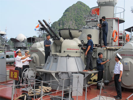 Cán bộ Lữ đoàn 170, Vùng 1 Hải quân kiểm tra công tác bảo quản vũ khí, trang bị kỹ thuật trên tàu 358, Hải đội 135. Ảnh: Vũ Xuân.