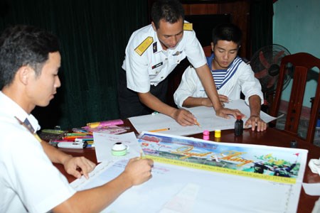 Trung tá Vũ Đình Tuân, Bí thư chi bộ, Chính trị viên Cụm CĐ2 đảo Nam Yết hướng dẫn chiến sĩ làm báo tường mừng xuân.