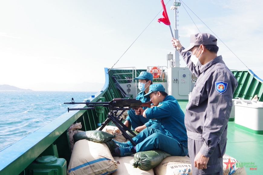 | Chiến sĩ Hải đội dân quân thường trực, Bộ CHQS tỉnh Khánh Hòa thực hành bắn đạn thật trên biển. Ảnh: VĂN CỐC. |