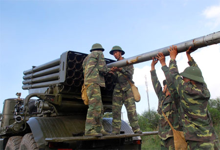 Khẩu đội BM-21 luyện tập động tác nạp đạn. Ảnh: Xuân Cường