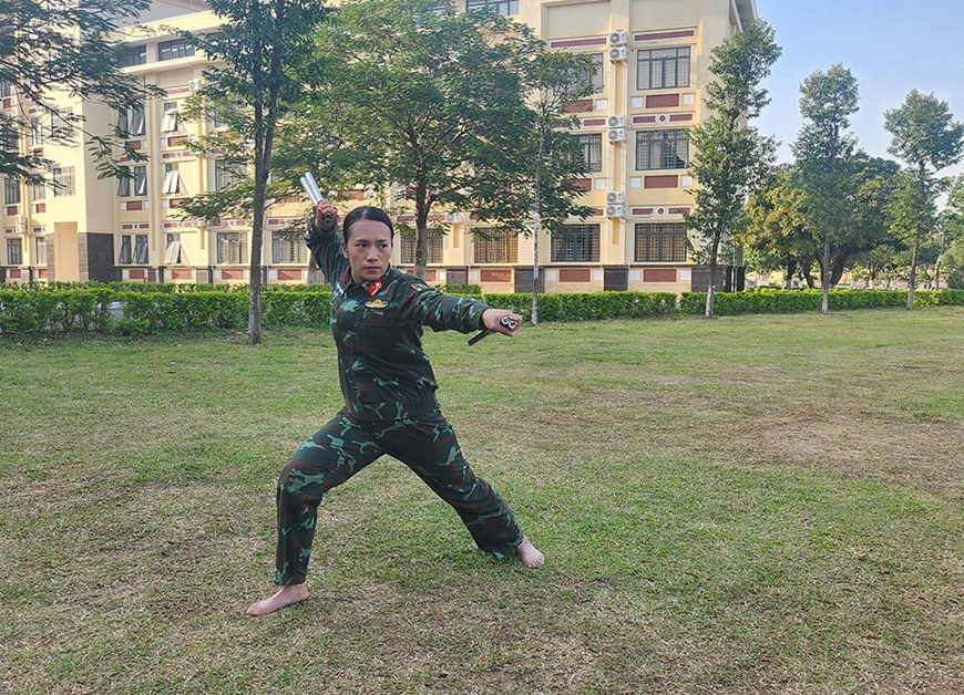 | Thiếu tá QNCN Âu Thị Như Quỳnh trong một bài tập. Ảnh do nhân vật cung cấp |