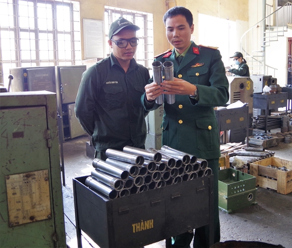 Đại úy QNCN Đinh Đức Thiện kiểm tra sản xuất mô hình súng B41 cắt bổ.
