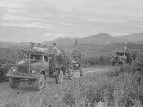 Lực lượng vận tải cơ giới vận chuyển bộ đội và vũ khí, trang bị, vật chất hậu cần phục vụ Chiến dịch Điện Biên Phủ. Ảnh tư liệu