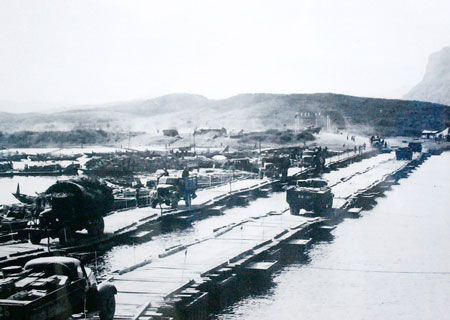 Bắc cầu phao trên bến phà Long Đại phục vụ giao thông vận tải chi viện chiến trường miền Nam. Ảnh tư liệu.