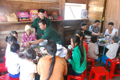 Bữa cơm tình thương cho học sinh nghèo do Đồn Biên phòng 721 tổ chức.