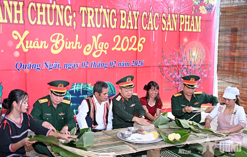 | Thiếu tướng Hoàng Văn Sỹ, Tư lệnh Binh đoàn 15 tham gia gói bánh chưng và ăn Tết với đồng bào xã Mô Rai, tỉnh Quảng Ngãi. |