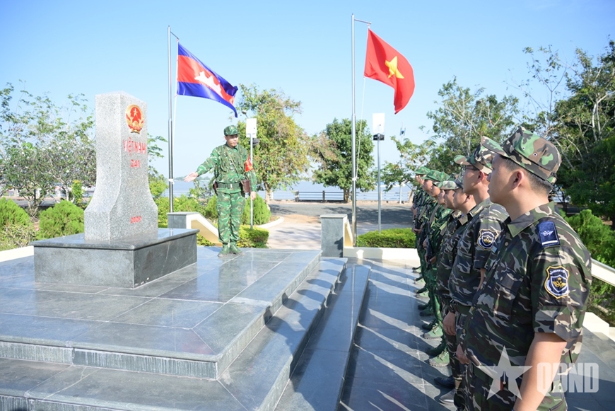 | Cán bộ, chiến sĩ Đồn Biên phòng Cửa khẩu Vĩnh Hội Đông bên cột mốc chủ quyền 260. |