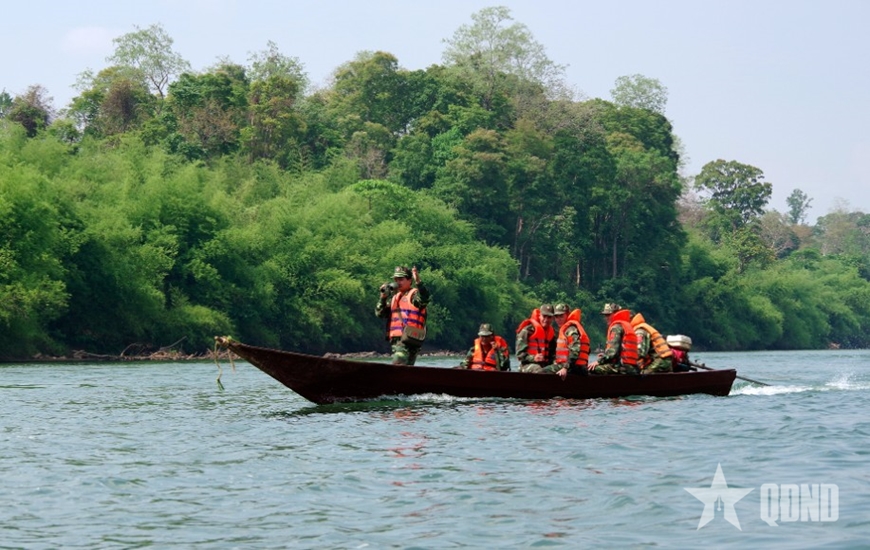 | Cán bộ, chiến sĩ Đồn Biên phòng Ia Chía (Ban chỉ huy Bộ đội Biên phòng tỉnh Gia Lai) tuần tra trên sông Pô Cô. Ảnh: THANH BÌNH |