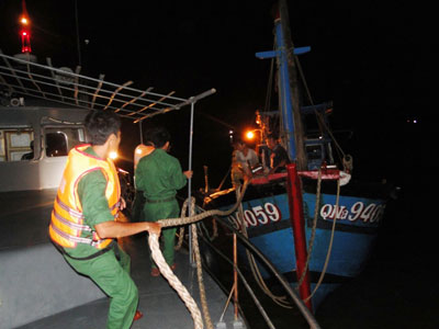 QĐND Online - Vào lúc 02 giờ ngày 12-5-2013, tàu BP 43-12-01 của Hải đội 2 Bộ đội Biên phòng (BĐBP) tỉnh Quảng Nam đã lai dắt thành công tàu cá QNa 94059 TS của ông Đặng Văn Hoa cùng 7 lao động đang gặp nạn trên biển vào bờ an toàn.