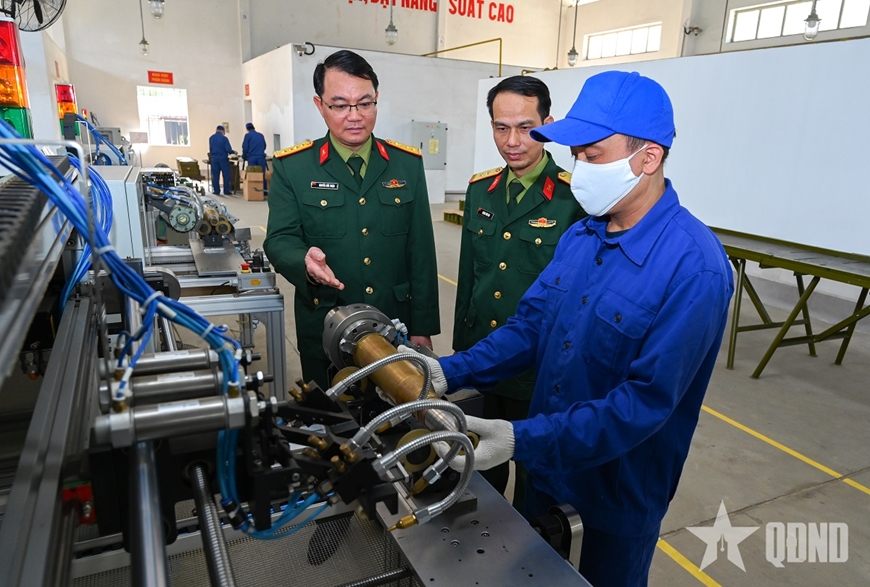 | Chỉ huy Kho KV1 kiểm tra công tác vận hành dây chuyền sửa chữa đạn dược bán tự động, tháng 3-2026. Ảnh: LÊ HIẾU |