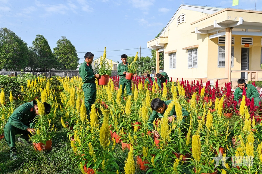 Đi trên đoạn đường đủ sắc cờ, hoa, nghe âm vang lời bài hát “xuân, xuân ơi, xuân đã về” phát ra từ chiếc loa truyền thanh nội bộ khiến lòng người chộn rộn, lâng lâng. Từng tốp chiến sĩ vui cười, vừa làm công tác chuẩn bị đón Tết, vừa chuyện trò, tâm sự Tết quê. Trên gương mặt những chàng lính trẻ rạng rỡ nụ cười, ấm tình đồng chí.