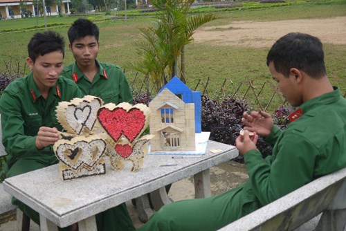 Chiến sĩ Trung đoàn 143 làm những món quà lưu niệm trước lúc ra quân. |