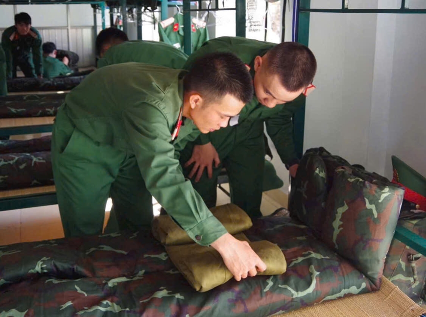 | Chiến sĩ mới học cách gấp chăn, màn. |
