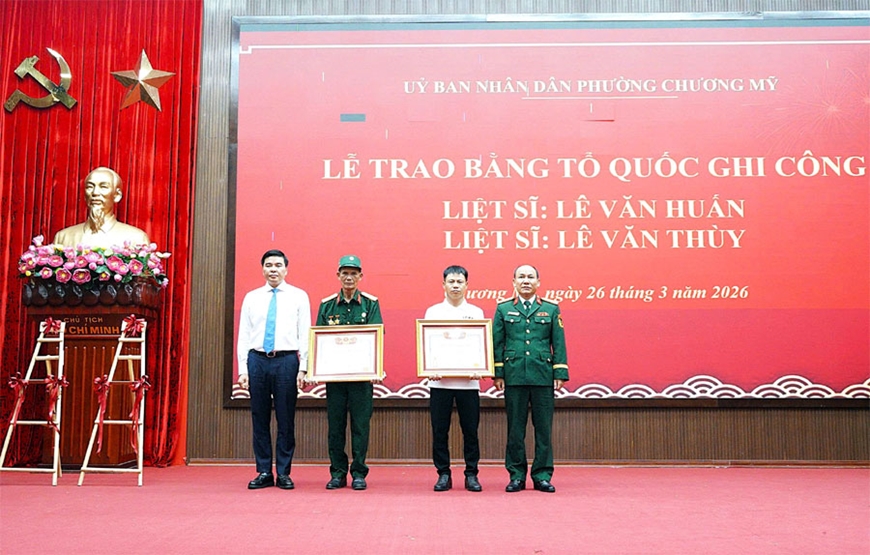 Cuối tháng 3 vừa qua, UBND phường Chương Mỹ (TP Hà Nội) đã tổ chức Lễ trao Bằng “Tổ quốc ghi công” đối với gia đình hai liệt sĩ là Lê Văn Huấn và Lê Văn Thùy (hai anh em ruột, cùng hy sinh trong kháng chiến chống Pháp).