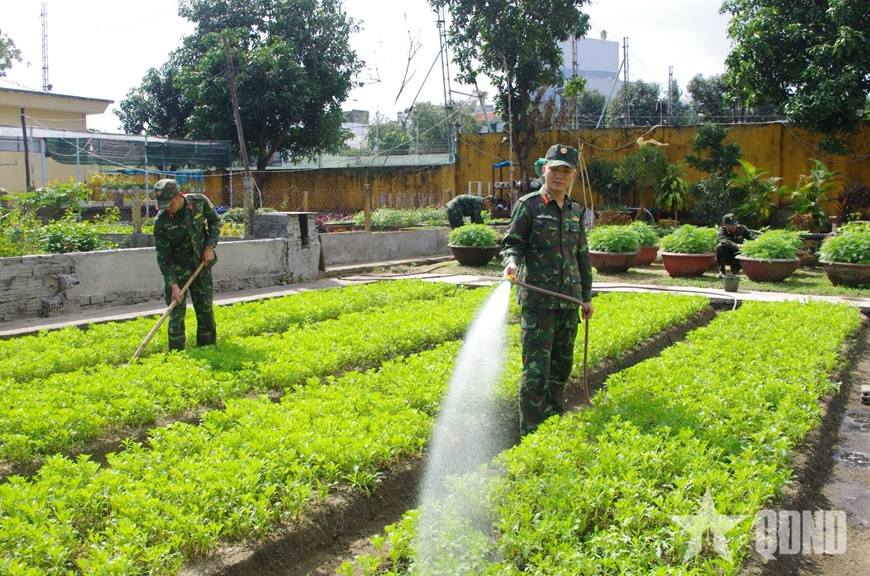 Đơn vị đóng quân ở trung tâm thành phố, song để bộ đội được ăn ngon, ăn sạch, Tiểu đoàn 8 vẫn dành được gần 3.000m2 đất phục vụ công tác tăng gia sản xuất. Sau những ca gác, tuần tra canh phòng vất vả, niềm vui của cán bộ, chiến sĩ trong đơn vị là được cùng nhau ra vườn làm đất, xuống giống, chăm sóc những luống cải xanh, cải bẹ, su hào, cà bát, cà pháo, đậu ve, giàn bầu, bí, su su, mướp đắng… thường xuyên được luân canh, gối vụ, phủ kín vườn giàn. Theo Trung tá Trần Xuân Bình, Tiểu đoàn trưởng Tiểu đoàn 8, ở nơi “tấc đất, tấc vàng”, quỹ đất, không gian hạn chế, mỗi luống rau, luống hoa đều được bộ đội quy hoạch, chăm sóc tạo nên điểm nhấn làm đẹp cảnh quan môi trường đơn vị.