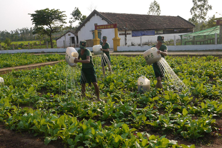 | Chiến sĩ mới chăm sóc vườn rau của đơn vị. |