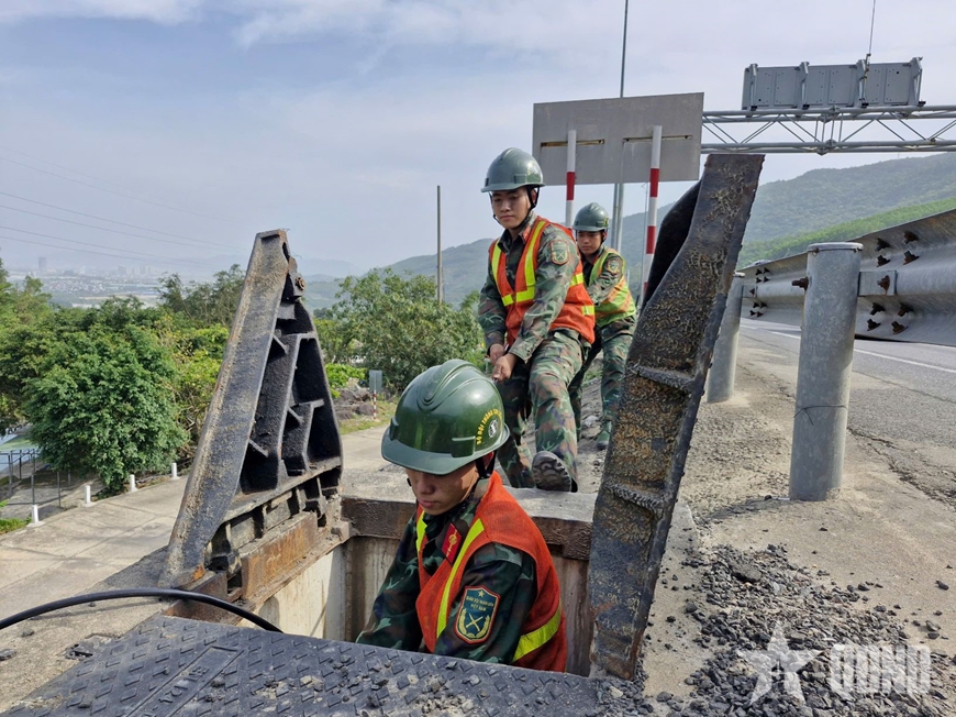 | Cán bộ, nhân viên, chiến sĩ Lữ đoàn 132 khắc phục sự cố trong đêm tối, trời mưa. Ảnh: TRẦN HOÀNG |