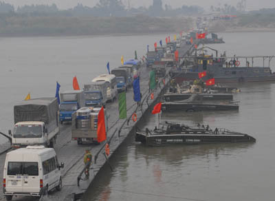Cầu phao từ đầu cầu phía Nam nhìn xuống