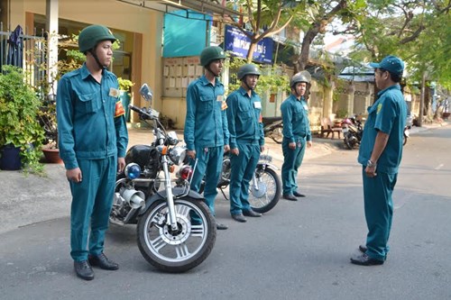 Cán bộ, chiến sĩ dân quân phường An Lạc A, quận Bình Tân, TP Hồ Chí Minh kiểm tra tác phong trước khi đi tuần tra.