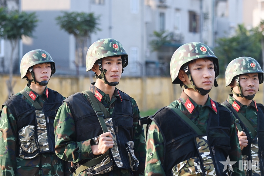 | Hạ sĩ Vi Gia Huy (thứ 2 từ trái sang), chiến sĩ Đại đội Trinh sát cơ giới, Phòng Tham mưu Bộ CHQS tỉnh cùng đồng đội luyện tập SSCĐ bảo vệ Đại hội XIV của Đảng. |