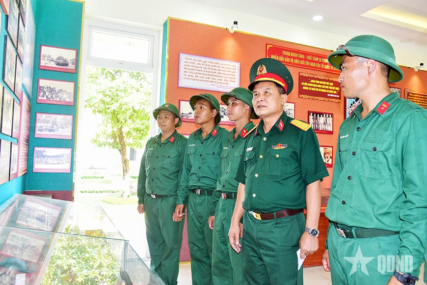 | Lãnh đạo Lữ đoàn 26 giáo dục truyền thống đơn vị cho chiến sĩ mới. |