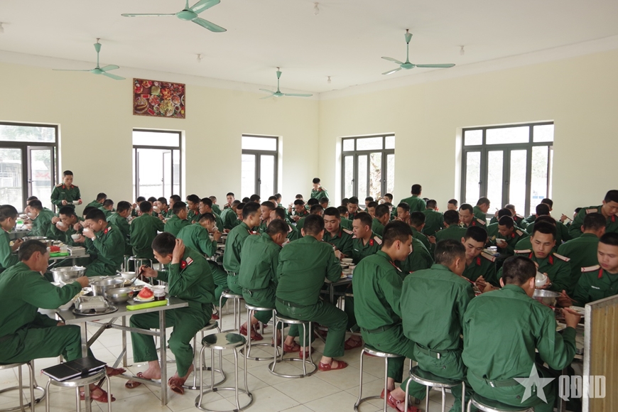 Đến giờ ăn, các trung đội nhanh chóng tập hợp, hành quân về nhà ăn trong đội hình ngay ngắn. Theo khẩu lệnh của trung đội trưởng, cả đơn vị cất cao tiếng hát những bài ca truyền thống. Những giai điệu quen thuộc vang lên giữa doanh trại, hòa cùng nhịp bước chân đều tăm tắp. Bữa cơm bộ đội đầy đủ dinh dưỡng, giúp chiến sĩ có đủ sức khỏe để hoàn thành nhiệm vụ huấn luyện.