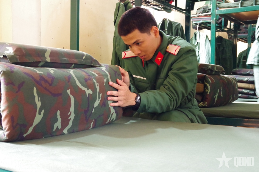 Trong phòng ở, nếp sống quân đội cũng được rèn luyện từ những việc rất cụ thể. Chiếc chăn bông quen thuộc khi vào đơn vị phải được gấp vuông vức như “bánh chưng”. Trung đội trưởng trực tiếp hướng dẫn từng thao tác, từ vuốt mặt chăn đến chỉnh các nếp gấp.