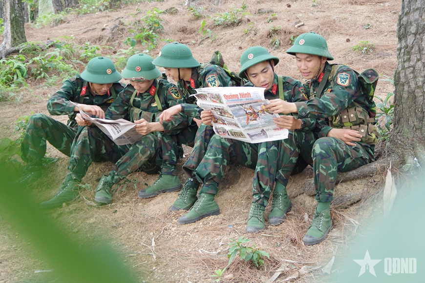| Chiến sĩ mới tranh thủ nghiên cứu sách, báo sau giờ huấn luyện trên thao trường. |