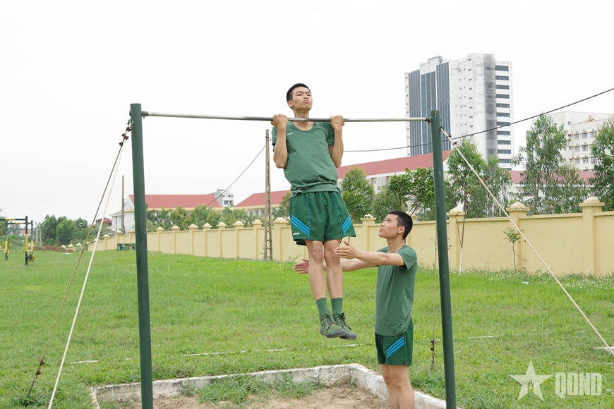 | Chiến sĩ mới tích cực rèn luyện thể lực với các nội dung co tay xà đơn, chạy bền. |