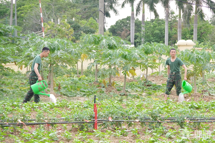 | Chiến sĩ mới đẩy mạnh tăng gia sản xuất, góp phần cải thiện đời sống bộ đội. |
