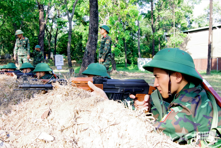 | Sư đoàn 309, Quân khu 7 tận dụng bóng mát để huấn luyện chiến sĩ mới. |