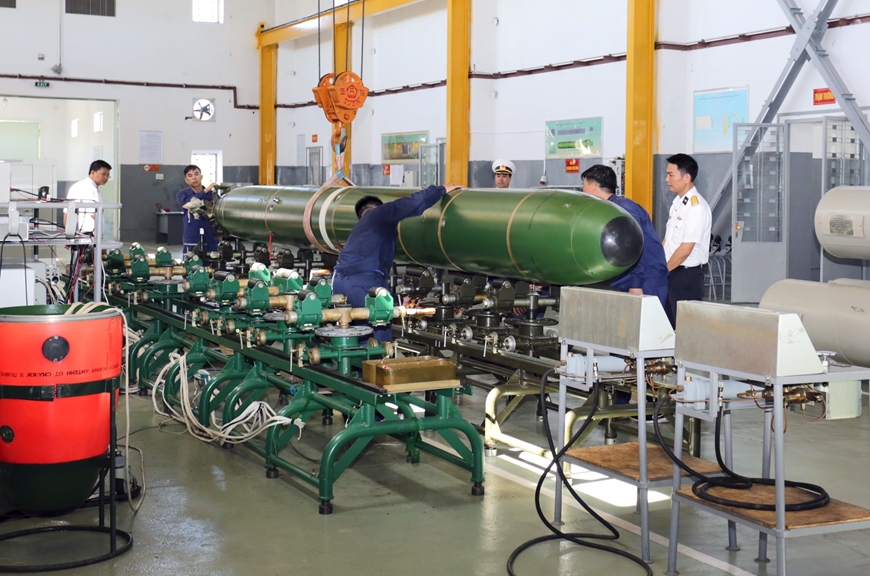 | Trung tâm Bảo đảm kỹ thuật 719 (Vùng 4 Hải quân) thực hiện bảo dưỡng vũ khí trang bị. Ảnh: QUỐC ANH |