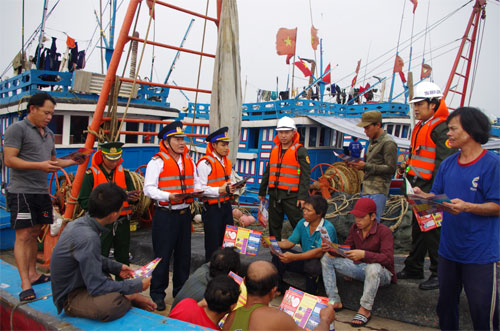 Cán bộ, chiến sĩ Cụm Đặc nhiệm PCTPMT số 1 tuyên truyền pháp luật cho ngư dân TP Hải Phòng.