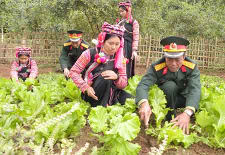 Cán bộ Đoàn KT-QP 379 hướng dẫn người dân xã Chung Chải, huyện Mường Nhé, tỉnh Điện Biên chăm sóc rau xanh.