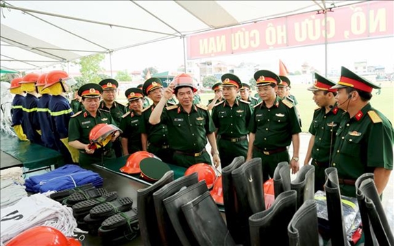 Đại biểu các cơ quan, đơn vị tham quan trang thiết bị bảo hộ lao động, dụng cụ PCCN và CHCN của Tổng cục Kỹ thuật. |