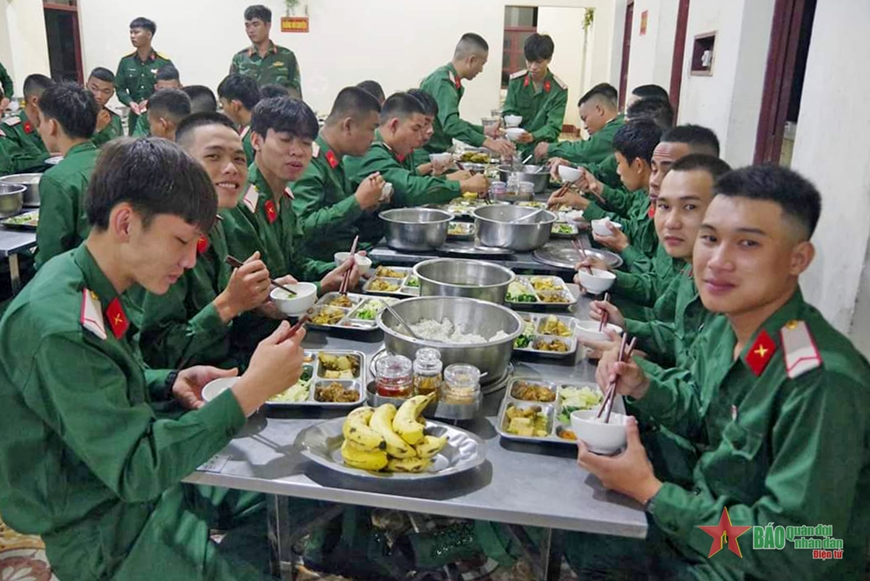 | Bữa cơm đầu tiên trong quân ngũ của chiến sĩ mới Trung đoàn 1, Sư đoàn 2 đầm ấm, ngon miệng. |