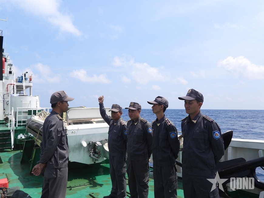 | Phó thuyền trưởng Nguyễn Hà Chung Việt giao nhiệm vụ cho tổ công tác. |