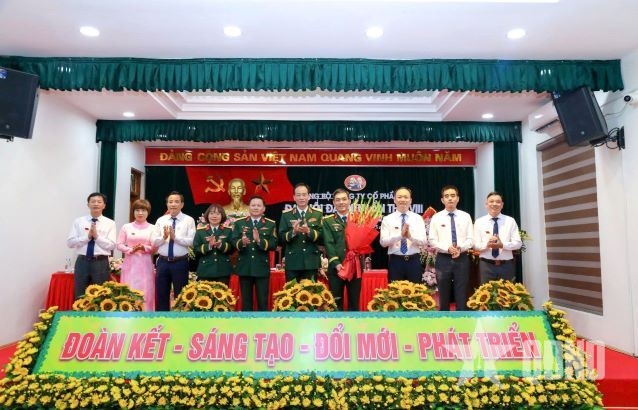 | Thủ trưởng Cục Chính trị (Tổng cục Hậu cần - Kỹ thuật) chúc mừng thành công Đại hội Đảng bộ Công ty Cổ phần 22 nhiệm kỳ 2025-2030. Ảnh: ĐỨC HUỲNH |