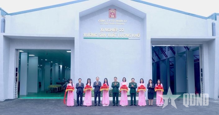 Lãnh đạo Công ty Cổ phần 22 cắt băng khánh thành Nhà xưởng sản xuất lương khô tháng 12-2025. Ảnh: ĐỨC HUỲNH