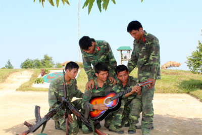 QĐND - “Vì nhân dân quên mình, vì nhân dân hy sinh. Anh em ơi vì nhân dân quên mình …”. Thật khó nói hết cảm xúc khi nghe màn “hợp xướng” ngân vang của những chiến sĩ mới trong giờ giải lao trên bãi tập. Chúng tôi thật ấn tượng khi đến bãi tập của Tiểu đoàn 5 (Trung đoàn 335, Sư đoàn 324, Quân khu 4). Dưới tán cây bạch đàn, từ khu vực huấn luyện bắn súng đến thao trường kỹ thuật chiến đấu bộ binh, từ xa chúng tôi nghe ngân vang lời ca, tiếng hát trong giờ giải lao của bộ đội. Cán bộ, chiến sĩ vây quanh chiếc đàn ghi ta, hát vang 10 bài hát quy định trong quân đội hòa trong tiếng vỗ tay rộn rã. Một không khí vui nhộn, làm quên đi sự mệt nhọc trong huấn luyện. Cùng với những bài hát tập thể là những màn đơn ca được xướng lên, bộ đội chăm chú lắng nghe, từng cung bậc cảm xúc hiện rõ trên nét mặt hân hoan của người chiến sĩ.