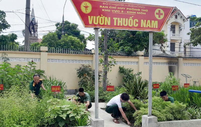 | Cán bộ, nhân viên Ban chỉ huy Phòng thủ khu vực 2-Kinh Môn, Bộ CHQS TP Hải Phòng chăm sóc vườn thuốc Nam trong giờ nghỉ. Ảnh: NGUYỄN TRƯỜNG |