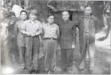 Đại tướng Võ Nguyên Giáp với Tư lệnh Chiến dịch Đường 9-Nam Lào Lê Trọng Tấn (ngoài cùng, bên phải) sau chiến thắng tháng 2-1971. Ảnh tư liệu.