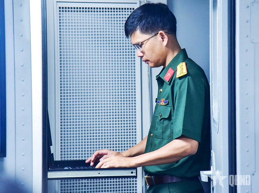 | Đại úy Nguyễn Văn Luận (bên trái) chỉ huy kíp trực trên hệ thống trinh sát điện tử hiện đại. |
